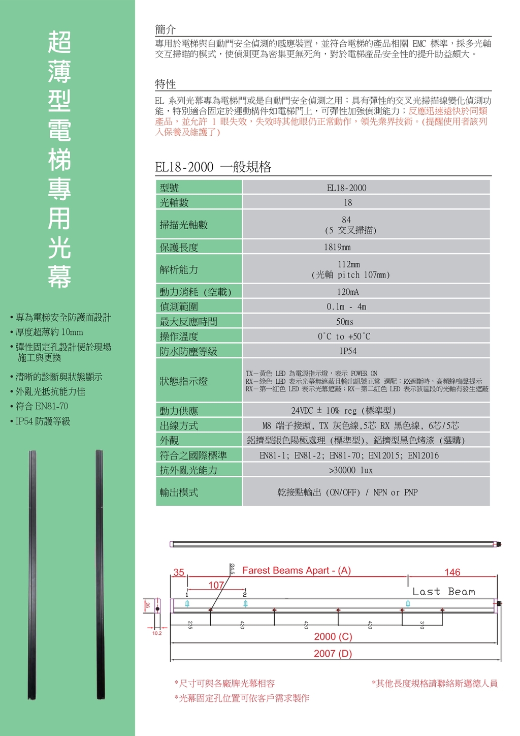 EL系列光幕專為電梯門或自動門安全檢測之用;具有彈性的交叉光掃描線變化檢測功能,特別適合固定於運動狀態如電梯門上,可彈性加強檢測能力;反應快遠快於同類產品,領先技術。 (提醒使用者應包含保養及維護了)