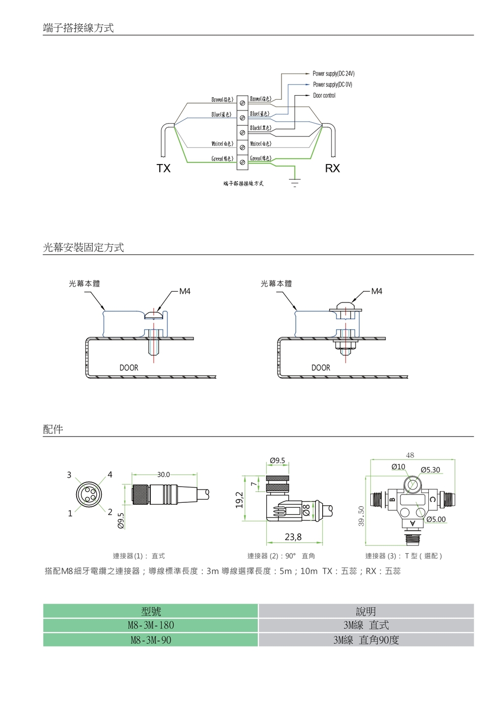 | LED燈 | TX-黃色 LED 為電源關閉,表示 POWER ON RX-LED 表示光幕無遮蔽且輸出訊號器正常選配:RX 關閉時,高頻蜂鳴聲提示 RX-第一紅色 LED 表示光幕遮蔽;RX-第二紅色 LED 表示此窗簾的光軸有遮蔽 | |