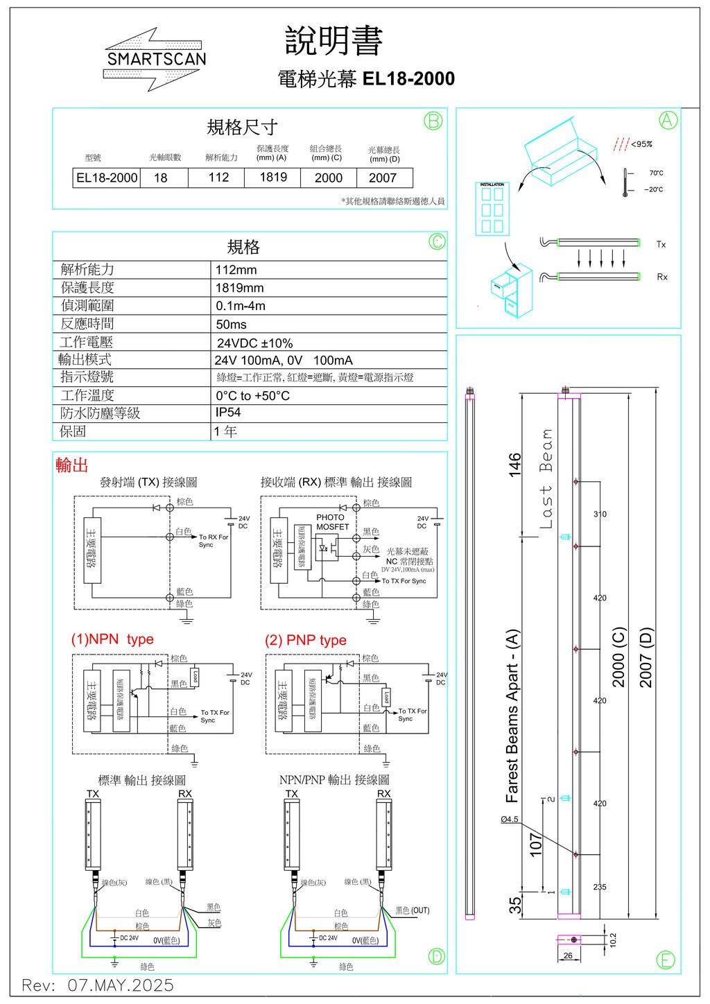 | 輸出模式 | 乾接點輸出 (ON/OFF) / NPN 或 PNP |