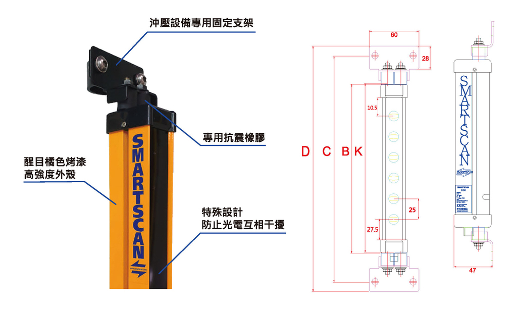 光軸數 | 型號 | 偵測區域 (K) (mm) | 型號 | 偵測區域 (K) (mm) | 光幕總長 (B) (mm) | 安裝長度 (C) (mm) | 組合總長 (D) (mm) |