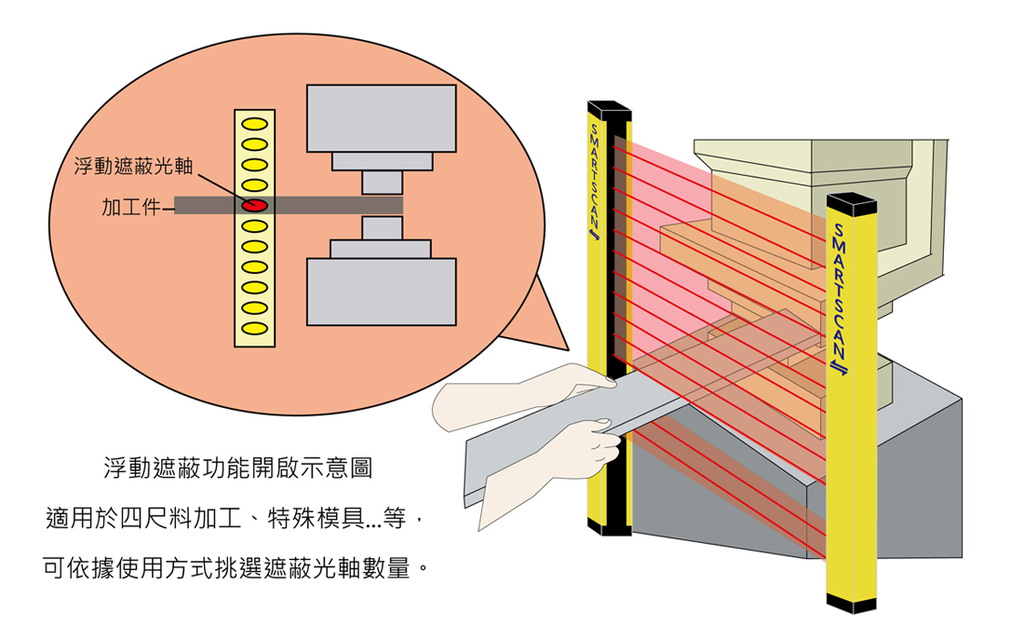 C4-1XX與C4-2XX系列除透過配線方式,也可以搭配C4M多功能安全控制模組開啟浮動與固定遮蔽功能,輕鬆透過鑰匙切換,達到靜默光幕、浮動遮蔽與固定遮蔽功能,使加工方式更加安全與便利。