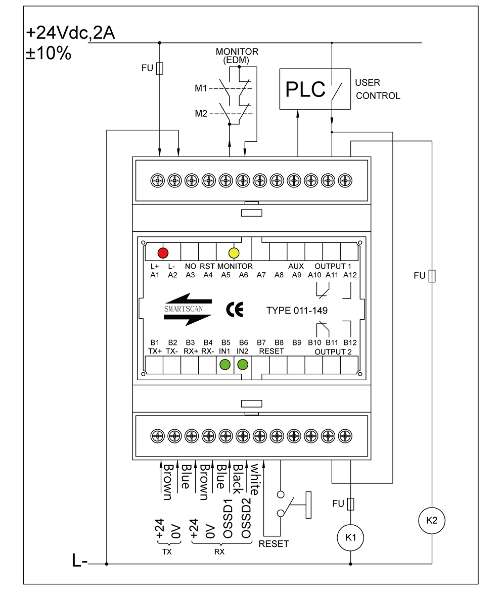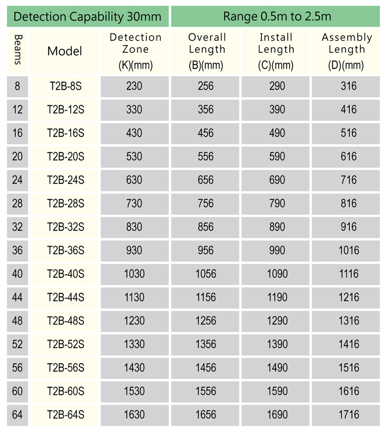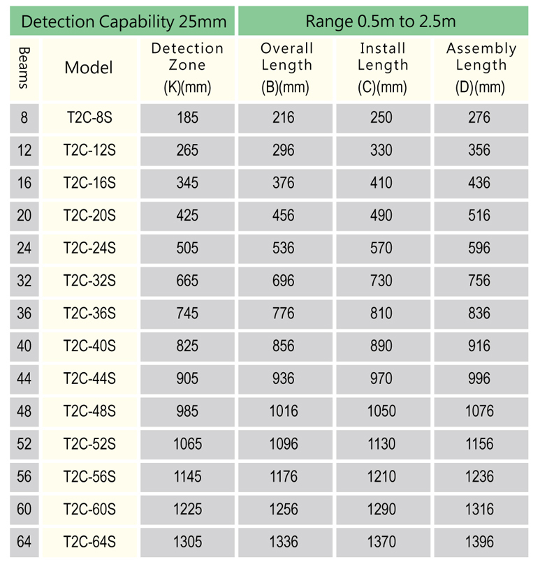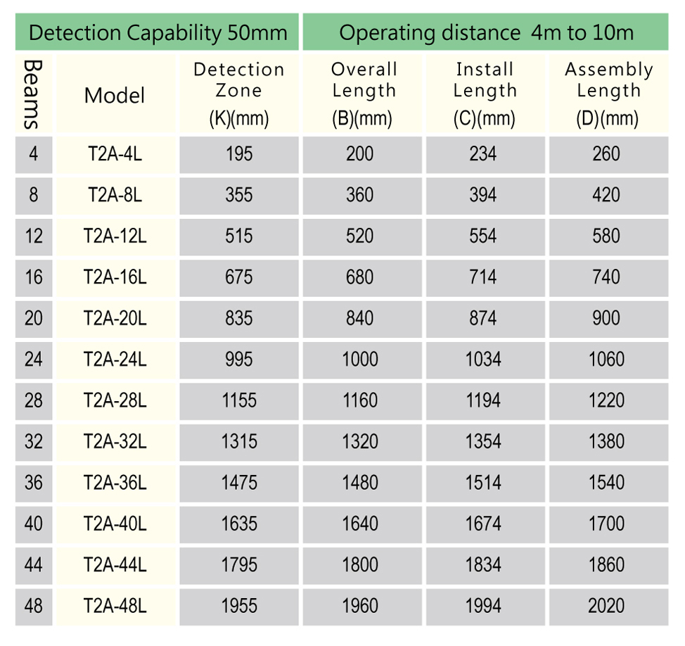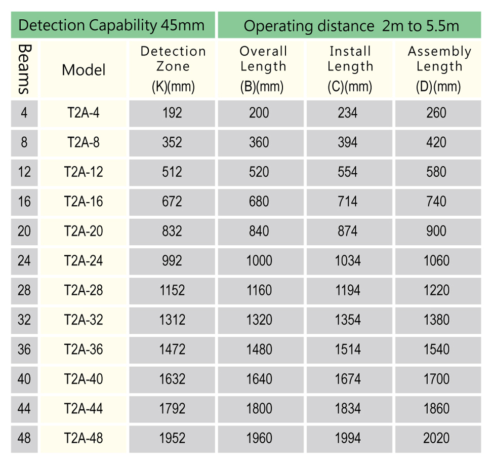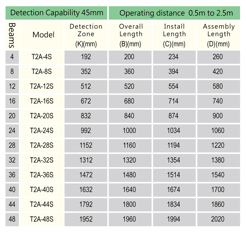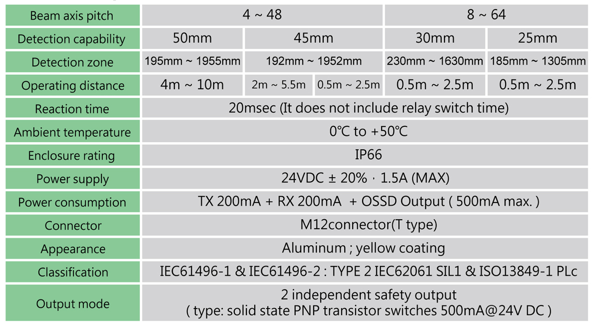 The T2 series safety light curtain optical design architecture is compact and in line with international safety standards. The light curtain as a whole also meets the safety requirements of the international safety standards IEC61496-1 and IEC61496-2 TYPE 2, and has obtained the certificate of conformity of well-known European certification bodies.