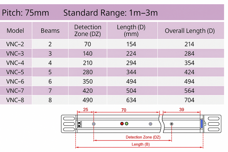 The VNC-series area sensing light curtains are versatile in terms of price and variety, and are easy to meet customer needs. They are the most suitable for use in a wide range of sensing light curtains for area detection, protection, inspection and discrimination. Instruction LVD requirements, with CE marking.