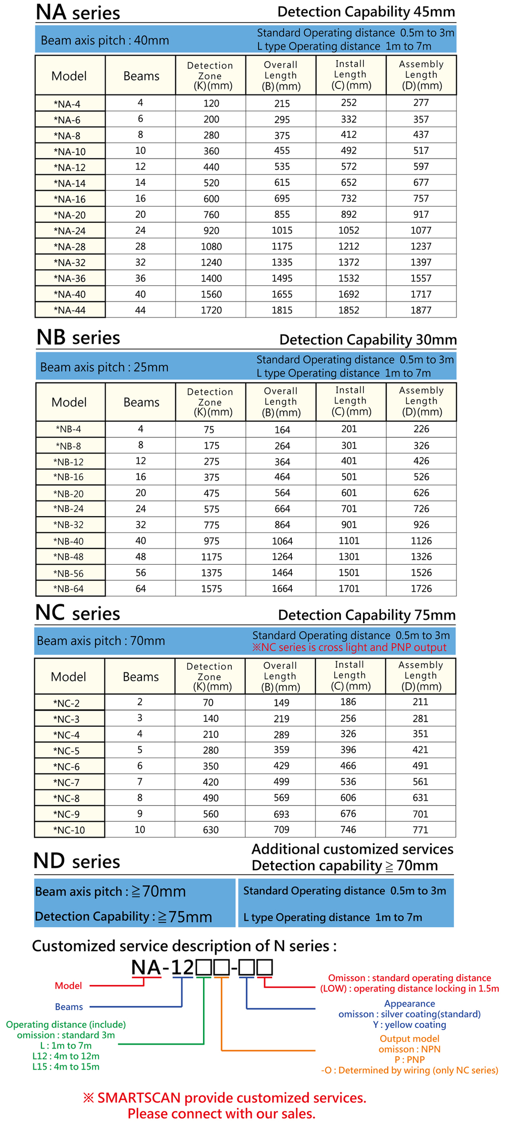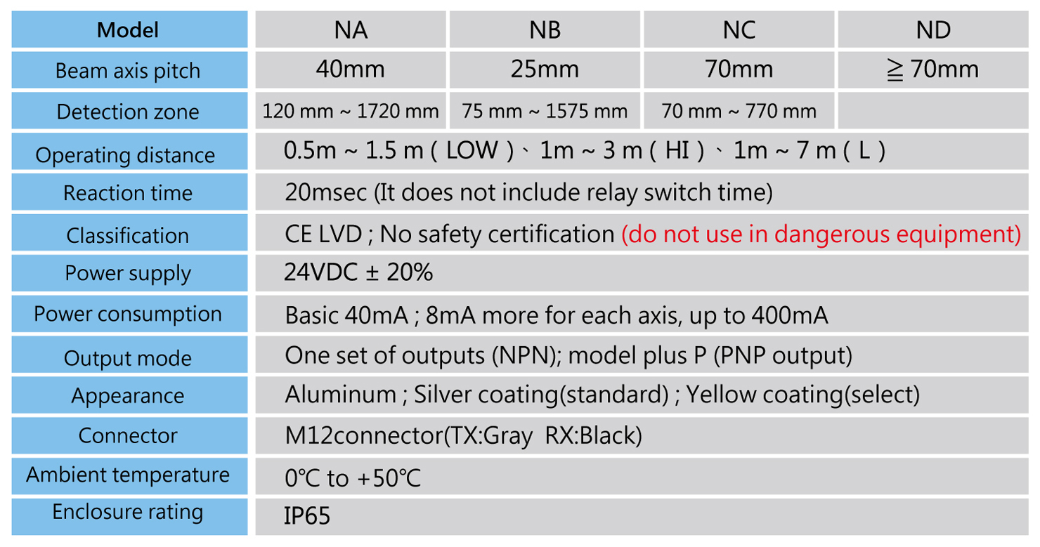 The N-series area sensing light curtains are versatile in terms of price and variety, and are easy to meet customer needs. They are the most suitable for use in a wide range of sensing light curtains for area detection, protection, inspection and discrimination. Instruction LVD requirements, with CE marking.