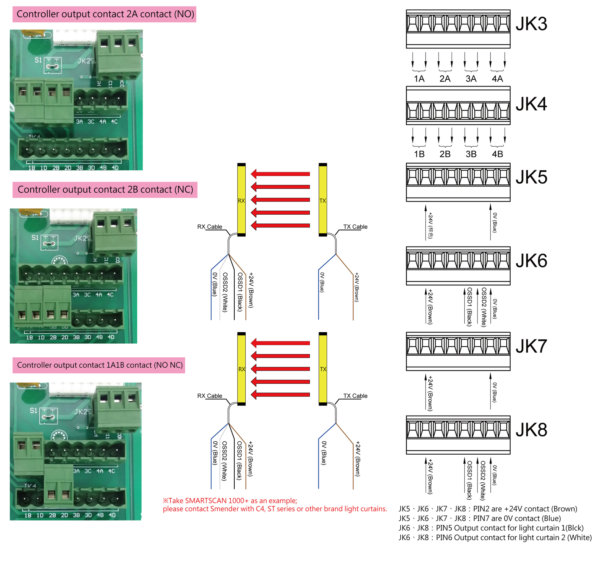 SMARTSCAN offers a variety of solutions :MUTE, A contact (NO), B contact (NC), warning output, double safety emergency stop, external monitoring, manual reset / automatic reset, to meet customer needs.