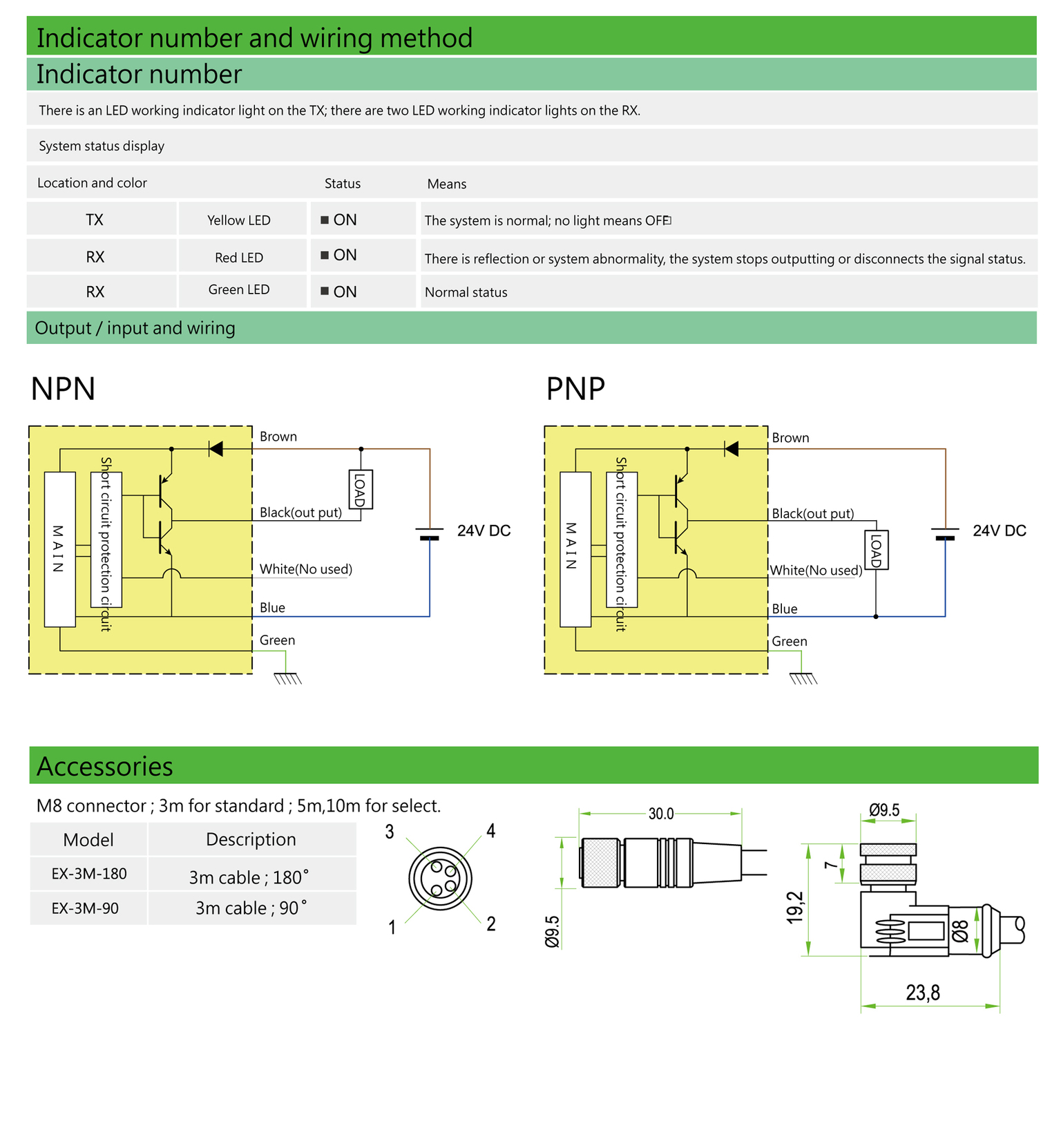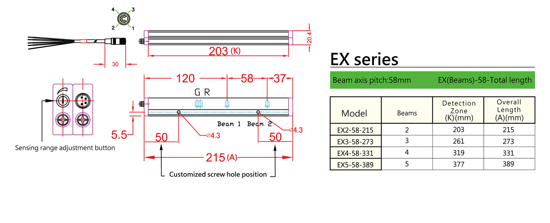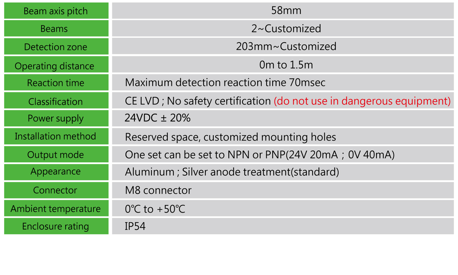 In addition to the traditional light curtain, the EX series is diffuse and reflective, the transmitting(TX) and the receiving(RX) are all on the same side, using the principle of self-light reflection of the object, suitable for the case where only one side can be installed, conforms to the EMC standard, and passes the third-party detection unit. certificate.