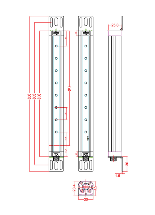光軸數 | 型號 | 偵測區域 (K) (mm) | 光幕總長 (B) (mm) | 安裝長度 (C) (mm) | 組合總長 (D) (mm) |
