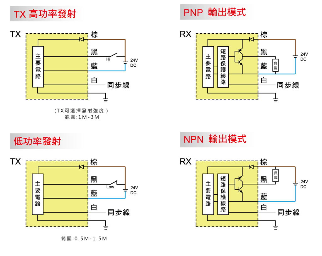 輸出模式 | 1組PNP輸出, 型號加註 O 為 NPN 輸出 |