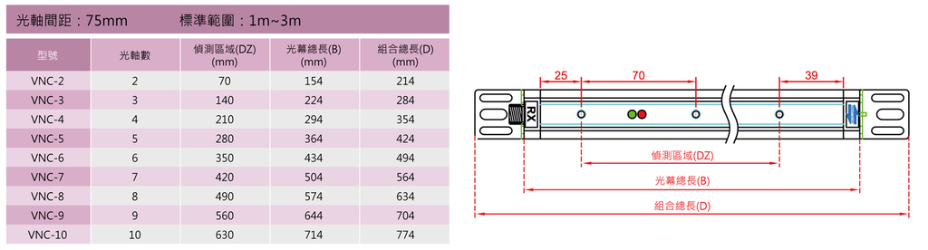 VNC 系列區域感測光幕,以價格優惠,型式種類多樣化,抗干擾性佳,易滿足客戶需求,是最適合使用於區域範圍內檢測、保護、檢查、判別等多樣化用途感測光幕,產品並符合歐洲電氣產品指令 LVD 要求,具 CE 標示。