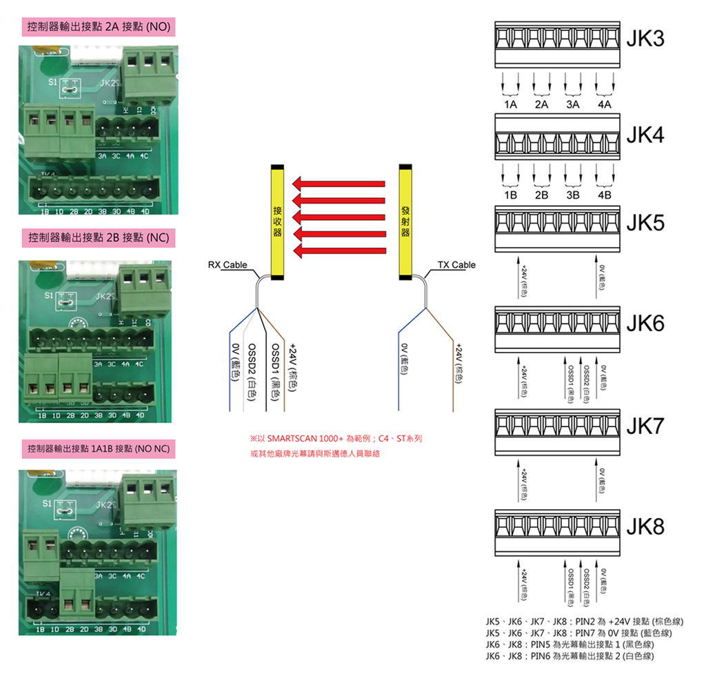 JK3:控制器輸出接點A接點(NO)(光幕1控制1A1C、2A2C。光幕2控制3A3C、4A4C)°